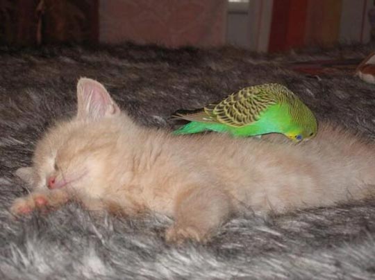 趣图:小鹦鹉戏耍酣睡猫 引其入鸟笼(2)