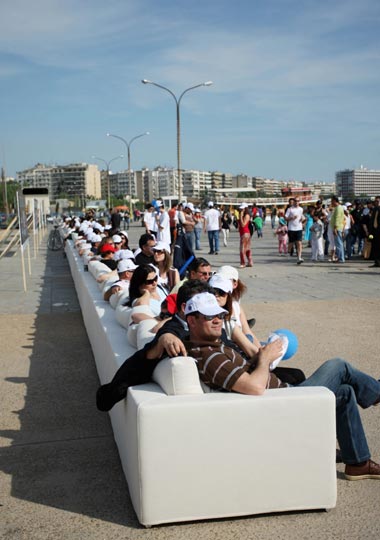 5月9日,在希腊港口城市塞萨洛尼基,人们坐在一条长64.75米的沙发上。这条沙发创下吉尼斯世界纪录,是世界上最长的沙发。