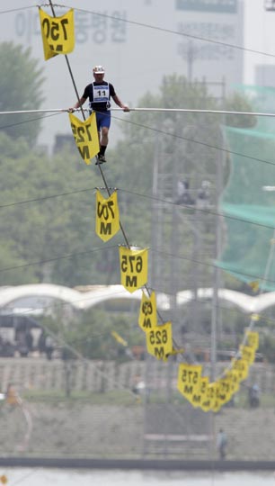 5月10日,韩国首尔举行了一场世界高空走钢丝的竞速大赛。比赛中,选手们将在一条横跨汉江的钢丝上走完1公里的路程。共有来自12个国家的20名选手参加了本次锦标赛。
