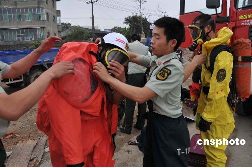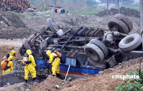 5月13日上午9时42分,福州市仓山区一辆装满醋酸乙烯的槽罐车侧翻,发生泄露。福州市消防支队迅速启动化学物品灾害事故处置应急预案,第一时间调集9部消防车,50多名消防官兵,火速赶往事故现场进行处置。下午16时,该事故被成功处置,没有造成任何人员伤亡。中新社发 朱晓航 摄