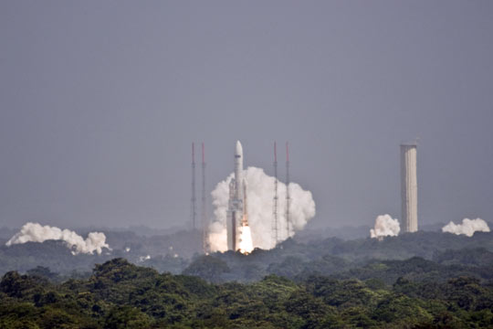 格林尼治时间14日13时12分(北京时间14日21时12分)欧洲阿丽亚娜5-ECA型火箭携带欧航局世界最大远红外线望远镜“赫歇尔”及宇宙辐射探测器“普朗克”,从法属圭亚那库鲁航天中心发射升空。