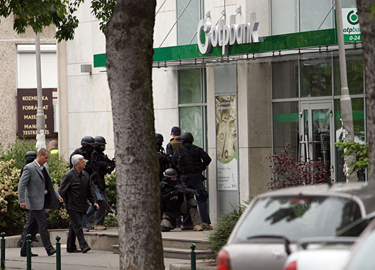 在匈牙利布达佩斯第14区,警察进入OTP银行。
