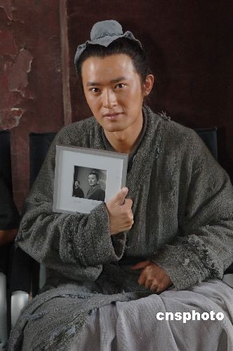 5月20日,胡玫的年度大戏《孔子》首次开放记者探班,十位记者齐聚涿州,揭开了这部“神秘大戏”面纱一角。当天下午,剧组拍摄的是一场重头戏“子见南子”,饰演孔子的周润发、饰演南子的周迅、饰演颜回的任泉,饰演鲁定公的姚橹,饰演孟孙何的王斑和饰演季孙斯的陈建斌等主要演员一一亮相。图为采访时,任泉说周润发酷爱摄影,并拿出一张发哥在片场“偷拍”他的照片向大家展示. 中新社发 李学仕 摄