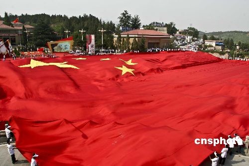5月25日,国际巨星成龙率领新中国成立六十周年献礼歌曲《国家》主创团队走进河北西柏坡,举办“国家·爱”主题活动,重温“新中国从这里走来”的辉煌一步。同时举办了新近制作完成的《国家》MV红色首映典礼,首映礼之后,五千平米的巨幅国旗在西柏坡缓缓展开,庄严的五星红旗被托起在革命圣地上空,代表着全体中国人民对日益强盛的祖国最诚挚的祝福,向世界华人传递信心与力量。 中新社发 王磊 摄