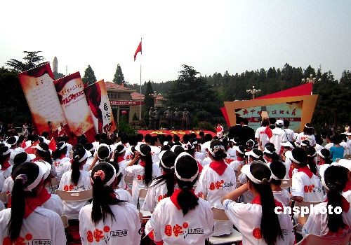 5月25日,国际巨星成龙率领新中国成立六十周年献礼歌曲《国家》主创团队走进河北西柏坡,举办“国家·爱”主题活动,重温“新中国从这里走来”。中新社发 刘广和 摄