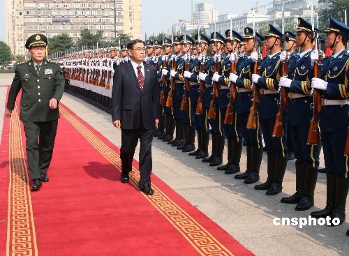 5月26日,中国国务委员兼国防部长梁光烈,在北京八一大楼会见来访的韩国国防部长李相憙,并为其举行欢迎仪式,陪同李相憙检阅中国人民解放军三军仪仗队。中新社发 宋吉河 摄