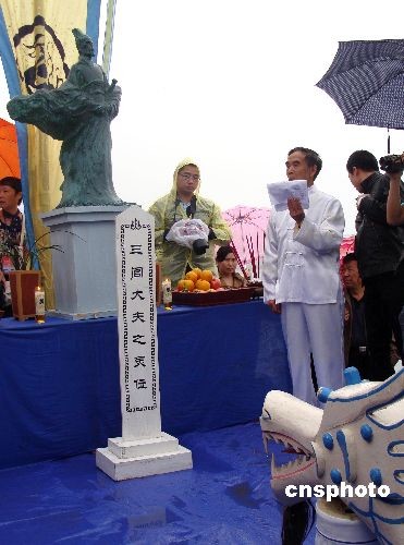 5月27日,湖北省秭归县中国秭归端午文化节开幕,当地冒雨举行盛大公祭仪式和龙舟竞渡活动纪念屈原。每年端午期间,秭归县都要隆重举行公祭屈原活动,从南北朝一直延续至今。图为祭祀长者在屈原像前恭读祭文。中新社发 刘良伟 摄