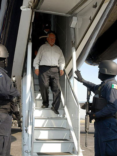 一名被逮捕的官员走下飞机。