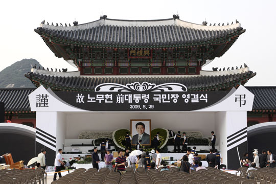 预定于本月29日举行的卢武铉国民葬,经过遗属和政府方面的协调,最终敲定在韩国首尔广场举行路祭。出殡仪式将于29日早晨5时从峰下村出发,预定于中午11时抵达首尔景福宫。下午1时开始在市厅广场举行约半个小时的路祭,然后前往水原火葬场,晚9时许返回峰下村。 图为28日,工人正在首尔的景福宫布置。
