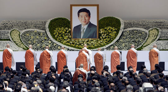 图为韩国佛教僧侣在卢武铉遗体告别仪式现场。