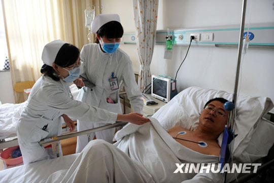 5月28日18时15分,在青岛香港中路东泰佳世客购物中心,一名男子持刀连续刺伤10名顾客和商场工作人员。民警随后与商场保安人员一起将正欲逃离的犯罪嫌疑人抓获。事件发生后,青岛市相关部门迅速启动突发事件应急预案,将伤员分别就近送往医院,经过医疗单位全力救治,伤者中1人因伤势过重经抢救无效死亡,其余9名伤者情况稳定,无生命危险。图为29日,青岛市立医院护士在查看一名伤者的伤情。(李紫恒摄)