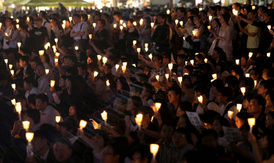 图:韩国民众在广场为卢武铉举行烛光祭——中新网