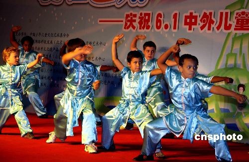 五月三十一日,二十名外国儿童在北京桥艺术中心表演中国太极拳。为庆祝“六·一”国际儿童节,中国少年儿童文化艺术基金会与中周网络科技发展(北京)有限公司联合举行“爱在飞翔——中外儿童爱心联欢会”。中新社发 曾利明 摄