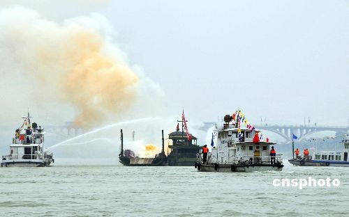5月31日上午,2009年四川南充市处置水上安全突发事件暨防洪抢险应急演练在嘉陵江南充城区段水域举行。武警部队、地方海事局等单位参加了包括救助落水乘客和遇险船只、水上消防灭火、处置大型水上漂浮物等项目的演练。中新社发 法良 摄