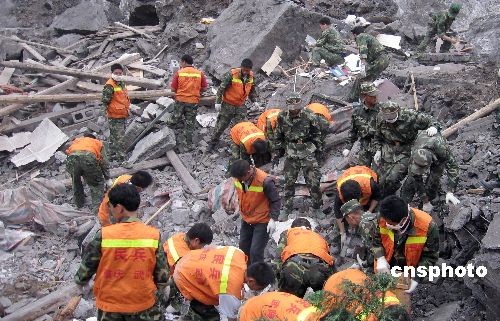 6月7日下午,参与救援的武警官兵挖开堆积的碎石和瓦砾,寻找遇难者遗体。中新社发 杜远 摄