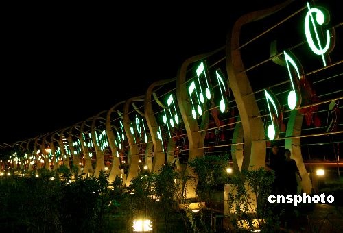 6月9日,游客从新疆克拉玛依河景区的音符长廊下走过。中新社发 周建玲 摄
