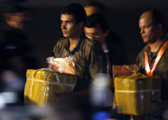 巴西空军人员将装有遇难者遗体残骸的盒子从运送飞机内抱出。