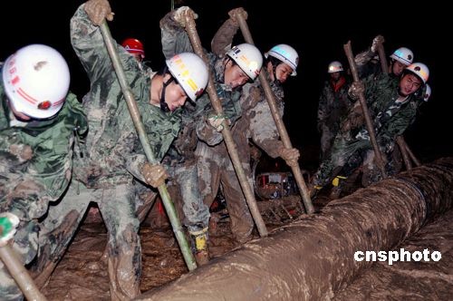 6月11日,重庆消防官兵为武隆堰塞湖泄流铺设排水管道。6月5日发生的重庆武隆县铁矿乡山体垮塌事故造成70多人被埋,大面积的崩滑体将两山之间的河流截断,形成了一个坝高百多米的堰塞湖。重庆启动了堰塞湖排危处置方案,将通过整理堰塞湖上游左岸凹槽,有计划地抽排积水到下游。救援人员连夜铺设了长约1公里的堰塞湖出水管道。中新社发 蒋勇 摄