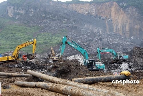 6月11日,重庆武隆山体垮塌现场,几台挖掘机正加紧施工修筑救援生命线。中新社发 郭晋嘉 摄