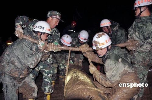 图:消防官兵冒雨铺设排水管道为堰塞湖泄流
