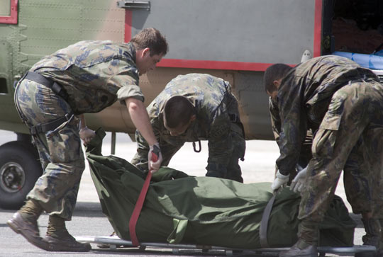 当地时间6月11日,又有12具法航失事客机遇难者遗体运抵巴西费尔南多-迪诺罗尼亚岛。9日,第一批法航失事客机遇难者的遗体运抵巴西。图为空军工作人员正在搬运遇难者的遗体。