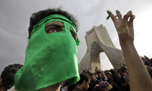 6月15日,成千上万的伊朗人走上首都德黑兰街头抗议现任总统艾哈迈迪内贾德赢得总统大选。在大选中落败的温和派候选人穆萨维对示威者发表了讲话。穆萨维说,大选有舞弊作假的问题,因此应该宣布选举结果无效。 图为戴着绿色面具的穆萨维的支持者。