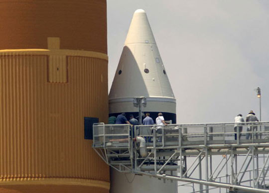 美国航天局15日说,“奋进”号航天飞机发生氢气泄漏的排气系统已经修复完毕,新的发射日期定在17日,而原定17日发射的两个月球探测器将推迟到18日或以后发射。图为15日,工作人员对“奋进”号航天飞机进行维修。