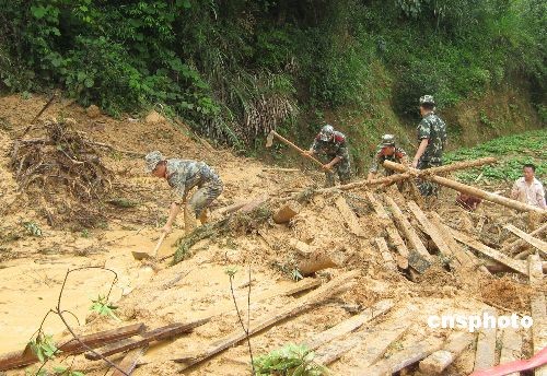 图:广东梅州遭暴雨袭击 武警官兵搜救失踪者(4)