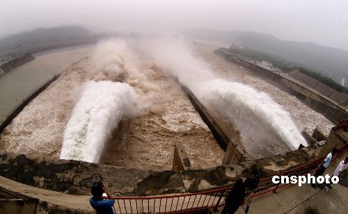 2009年6月19日,在黄河小浪底大坝的观水台,观瀑的游客在感受“黄河之水天上来”的意境。当日9时整,黄河小浪底大坝2个排沙洞同时开启,放水量达到每秒2600立方米,形成壮丽的巨瀑景观,黄河第九次调水调沙正式开始。此后小浪底水库及其下游16公里处的西霞院水库下泄流量逐日增大,6月23日左右控制黄河花园口流量约4000m3/s下泄。 中新社发 张晓理 摄