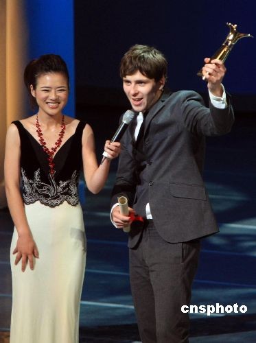 6月21日晚,第12届上海国际电影节闭幕盛典在上海大剧院举行,来自丹麦/瑞典的电影《原创人生ORIGINAL 》主演斯维里亚.古德纳森(右)获得“金爵影帝”。 中新社发 汤彦俊 摄