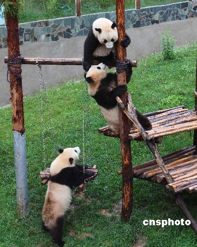 6月22日,寄养在云南野生动物园的灾区熊猫在快乐玩耍。去年,三只来自地震灾区四川卧龙的熊猫宝宝被寄养在云南野生动物园,经过近一年的精心照料,现在三只熊猫已经完全适应了昆明的生活,在动物园健康成长。中新社发 刘冉阳 摄