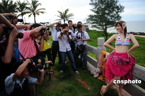 2009年6月28日,亚洲小姐参赛选手在海口展风采。当日,2009亚洲小姐大赛中国海南赛区参赛选手与市民互动活动在海口市举行。20位亚洲小姐在海口西海岸一展风采,吸引了大批游人和摄影爱好者。 中新社发 蒙钟德 摄