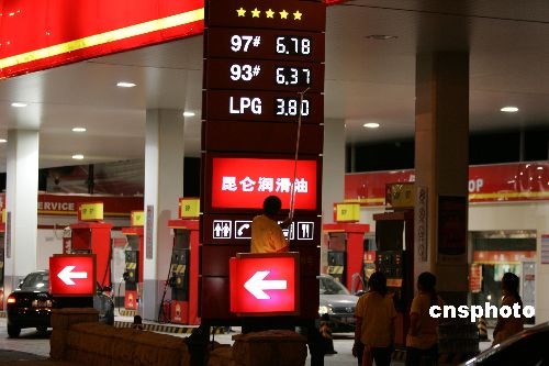 6月30日零时,中石油北京市内的加油站工作人员调整价格牌。中新社发 廖攀 摄