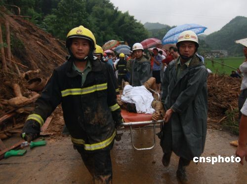 7月2日,消防官兵和民兵正在湖南娄底市双峰县石牛乡山口村山体滑坡现场实施救援。7月2日12时20分左右,湖南娄底市双峰县石牛乡山口村发生一起山体滑坡,一栋村民的房屋被毁。在该村蹲点的乡镇干部彭志炬和村支书李三觉、党员张集庄等3人在疏散群众张应理时被掩埋。 灾情发生后,双峰县领导迅速赶赴现场,调集挖掘装备和一批消防武警、民兵、医护人员,紧急搜救,并及时转移安置其他受山体滑坡威胁的村民。 下午5时,被山体掩埋的李三觉、张集庄、张应理、彭志炬4名遇难者的遗体被找到,目前善后工作正在进行。 中新社发 郭国权 摄