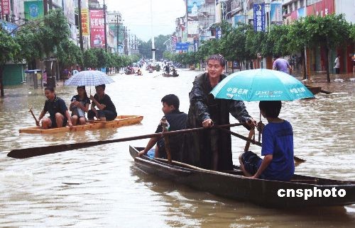 7月3日,广西融水苗族自治县县城的几位居民坐船回家。连日的强降雨导致该县河水暴涨,20个乡镇受到不程度的水灾,县城一些小区、街道、市场成了汪洋一片。目前,当地政府已采取有效的防洪措施,迅速组织人员展开救援。