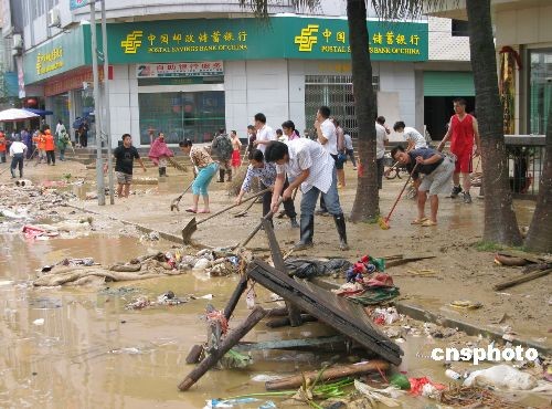 7月5日,广西融水县洪水退却,市区内留下一片狼籍,居民开始大规模清淤工作。