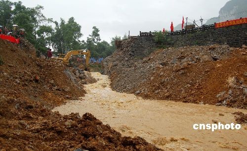 图:广西卡马水库大坝打开缺口泄洪暂缓险情(2)