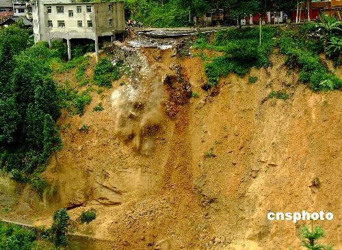 2009年7月6日13时53分,贵州308省道雷山县桃江乡境内180公里+950米处发生大面积路基坍塌,坍塌的路基长约30米,宽近100米,深约10米,呈喇叭状,上窄下宽,大量土石顺着山体滚下垂直距离约200米的小河。目前,坍塌已造成该路段交通中断。中新社发 杨昌澌 摄