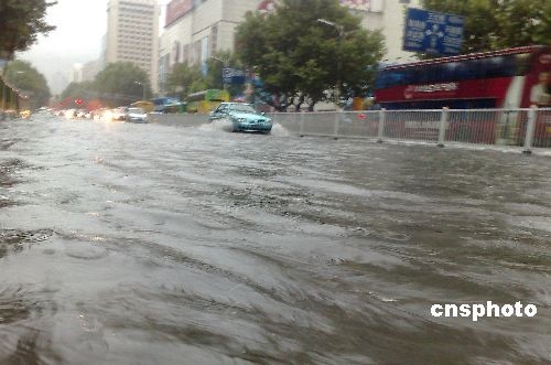 七月七日,南京市区遭遇暴雨,市区一片泽国。据江苏省气象台消息,南京、镇江、盐城、扬州、泰州五地先后拉响雷电橙色、雷电黄色预警,江苏全省十三市拉响暴雨蓝色预警。中新社发 王秀青 摄