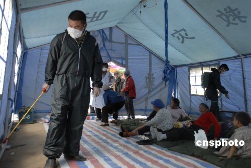 云南省姚安县7月9日发生6级地震后,当地卫生、医疗、民政、疾控、武警等部门人员积极开展了抗震救灾工作。图为7月10日,当地疾控人员为灾区民众临时安置点进行消毒。中新社发 徐向良 摄