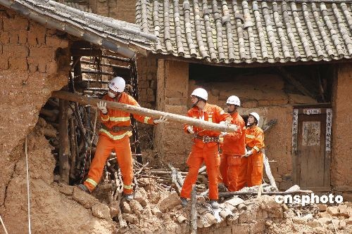 7月9日19时19分,云南省楚雄彝族自治州姚安县发生6.0级地震,造成1人死亡、300多人受伤,大批民房受损。地震发生后,武警、消防、公安全力以赴开展抗震救灾。图为7月11日,正在排除危房的消防官兵。中新社发 刘冉阳 摄