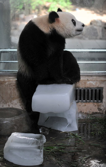 2009年7月13日,武汉动物园的大熊猫“希望”用冰块“乘凉”。周超/cfp