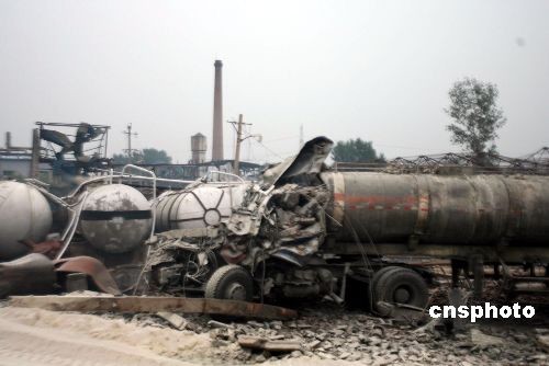 图为爆炸事故现场停放在厂房内的油罐车被炸的面目全非。中新社发 王中举 摄