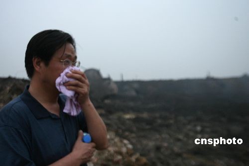 图为事故现场气味刺鼻抢险人员用手掩鼻。中新社发 王中举 摄