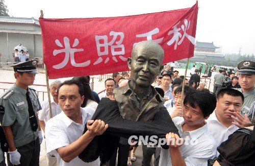 7月19日,著名国学大师季羡林先生的遗体告别仪式在北京八宝山革命公墓东礼堂举行,民众抬雕像送别悼念国学大师季羡林。中新社发 吴芒子 摄