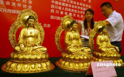 7月21日上午,一场由中国收藏家发起的支援汶川灾后重建的“汶川感恩·国宝献汶川”爱心行动在北京人民大会堂举行,来自全国各地的100多位收藏家代表现场捐赠60多件珍贵文物,其中不乏价值连城的国家级文物。这批藏品义卖所得将全部用于汶川灾后重建。图为明永乐年间“铜鎏金三世佛”。中新社发 郑雄增 摄