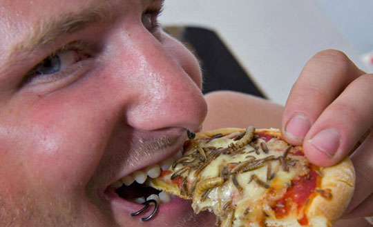 当地时间7月22日,瑞士尼翁,一男子正在品尝虫子比萨饼。这种比萨饼是用奶酪、番茄和面粉幼虫等配料制作而成的。