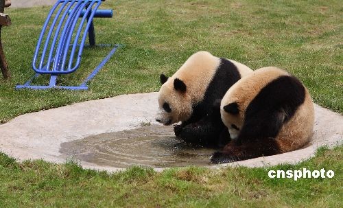 7月23日,正在昆明野生动物园“泡澡”消暑的熊猫。今天是大暑,三只来云南野生动物寄养的灾区熊猫思嘉、美茜、芊芊依旧不停的打闹,感觉酷热难耐的时候就会跑到水池里躺着消暑,感受炎炎夏日中的清凉。中新社发 刘冉阳 摄