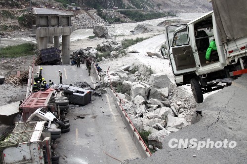 7月25日凌晨4时10分左右,中国国道213线汶川段彻底关大桥被巨石砸毁,造成一百米的桥面坍塌。截至8时30分,7辆汽车坠下大桥,已致3人死亡,12人不同程度受伤,都汶路通行中断。目前,当地正全力以赴抢救伤员、搜救被困民众,送往医院的伤员没有生命危险。图为断桥现场。中新社发 汶新 摄