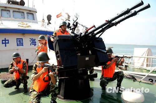 7月29日,江苏边防总队连云港海警大队通过海上巡逻、快速出击、等各类模拟演练,打造实战背景下的应急处突能力。中新社发 王春 摄